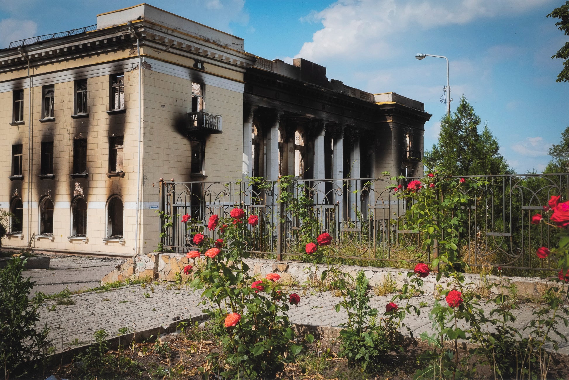 3. Red roses are seen against the background of a city theatre ruined in the Russian shelling in Lysychansk, Luhansk region, Ukraine, Thursday, June 16, 2022.