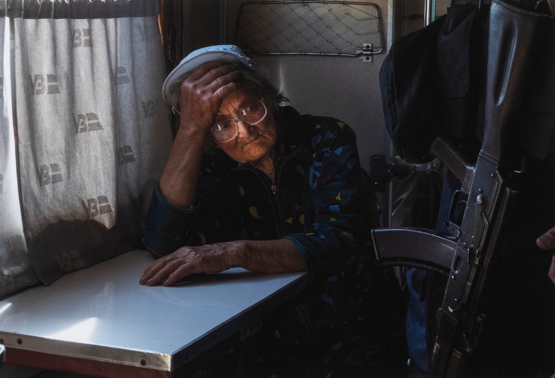 4. An elderly woman evacuated from the war hit area sits inside an evacuation train waiting for departure while a soldier passes by her in Pokrovsk, eastern Ukraine, Monday, June 20, 2022.